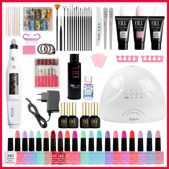Набір для манікюру та педикюру - великий стартовий набір (Фрезер-ручка, Лампа 24/48Вт, 20гель-лаків, полігель, база, топ, ремувер)